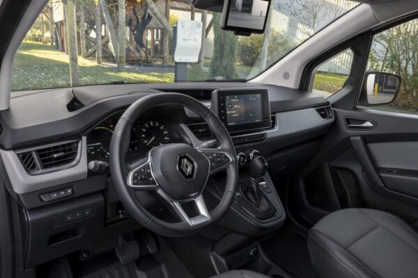Il van sfrutta tre livelli di frenata rigenerativa: bassa, adatta alla guida in autostrada e su strade a scorrimento veloce, media, per una maggiore versatilità di utilizzo e una sensazione al pedale simile a quella dei veicoli termici e massima, adatta per la guida nel traffico intenso e in montagna. Renault Kangoo Van E-Tech Electric offre una capacità di carico fino a 3,9 metri cubi con una portata di 600 kg. Degne di nota le porte “Open Sesame” caratterizzate dalla mancanza del montante centrale sul lato destro con un’apertura pari a 1,45 metri, e lo specchietto retrovisore digitale. Driver display a colori da 10 pollici e sistema multimediale Easy Link con schermo da 8 pollici. Comoda la posizione di guida con lo sterzo leggero e preciso, non sembra di guidare un van, ma una monovolume. Il furgone scorre bene su strada nonostante il carico simulato di 150 kg con due persone in cabina: guidatore e passeggero.