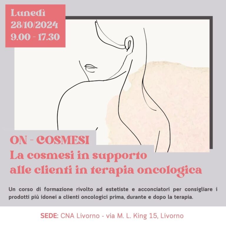 E’ ormai appurato che le estetiste e gli acconciatori possono avere un ruolo nel supporto dei clienti in trattamento oncologico attraverso un uso attento e specifico della cosmesi; occorre però una adeguata formazione ed è per questo che CNA Livorno organizza un corso di formazione rivolto alle estetiste e agli acconciatori per consigliare i prodotti più idonei ai clienti oncologici, prima durante e dopo la terapia. Il corso “On-Cosmesi” sarà tenuto dal farmacista e psicologo Umberto Borellini, specializzato in Scienza e Tecnologia Cosmetiche; associato alla SICC (Società Italiana di Chimica e Scienze Cosmetologiche) dal 1989, nonché membro di vari board scientifici quali IRDEG, AMIA e SKINECO, è anche socio onorario CIDESCO (Comitato Internazionale di Estetica e Cosmetologia). Il programma prevede la trattazione di argomenti essenziali per una adeguata preparazione in materia come: Cenni di anatomia fisiologica della cute; Legislazione cosmetica; Principali ingredienti di un cosmetico e ingredienti “attenzionati”; Eccipienti, additivi e sostanze funzionali; Sicurezza e qualità di un cosmetico; L’importanza della barriera cutanea (protezione e ripristino); Guida alla lettura delle etichette; La cosmesi oncologica, make up e trattamento per capelli; Cenni di psicosomatica e neurocosmesi applicata.