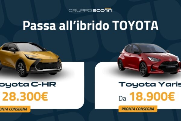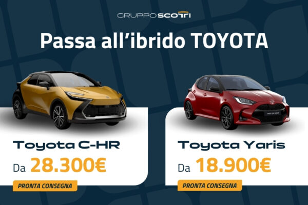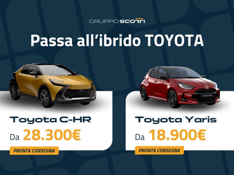 Solo questo mese da Gruppo Scotti trovi Toyota Yaris e CHR Hybrid in pronta consegna con sconti fino a 8.000€, finanziamenti su misura, fino a 15 anni di garanzia con Toyota Relax e due weekend di porte aperte per provare tutta la gamma. In più, se acquisti un treno di pneumatici (invernali, 4 stagioni o estivi), ricevi un omaggio per la cura dell’auto (Toyota Kit Car Care) e un 40% di sconto sulle spazzole tergicristallo. Tra le promo del mese spiccano la nuova Toyota C-HR da 28.300€, disponibile in versione full-hybrid e plug-in hybrid, e la Yaris Hybrid da 18.900€, con motorizzazione full-hybrid da 116 o 130cv. Entrambi i modelli sono in pronta consegna, e offrono la tecnologia ibrida Toyota per una guida fluida, consumi ridotti e una dotazione tecnologica completa, inclusi i sistemi di sicurezza Toyota Safety Sense.