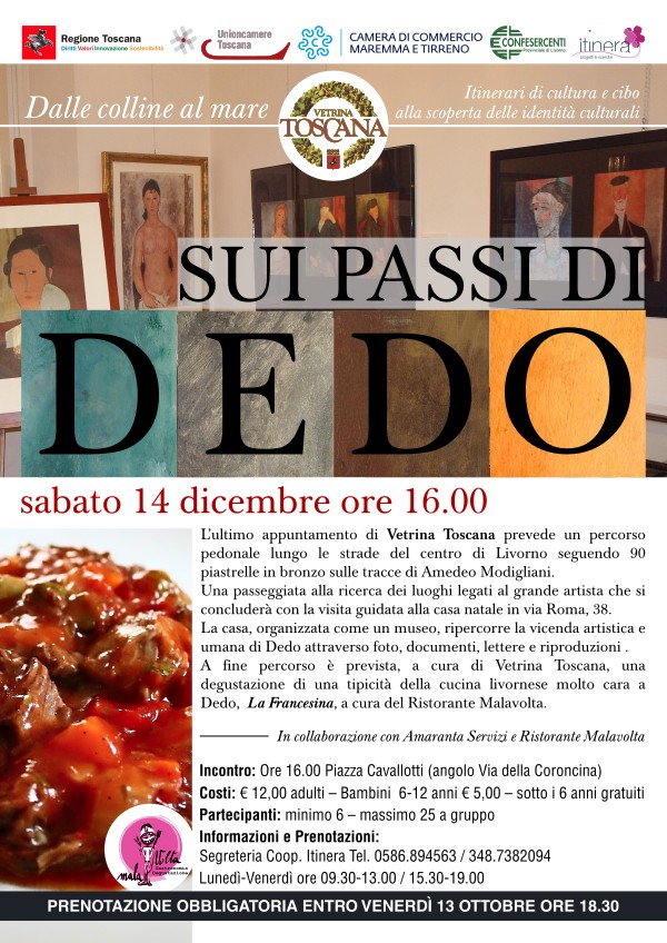 L’ultimo appuntamento di Vetrina Toscana prevede sabato 14 dicembre, ore 16, “Sui passi di Dedo”, un percorso pedonale lungo le strade del centro di Livorno seguendo 90 piastrelle in bronzo sulle tracce di Amedeo Modigliani. Una passeggiata alla ricerca dei luoghi legati al grande artista che si concluderà con la visita guidata alla casa natale in via Roma, 38. La casa, organizzata come un museo, ripercorre la vicenda