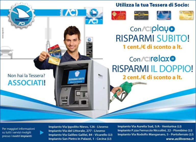 ACI Livorno ricorda inoltre dello sconto immediato per tutti i possessori della Tessera Aci: 2 Cent./EUR Aci Relax (servito) e 1 Cent./EUR Aci Play (self).
