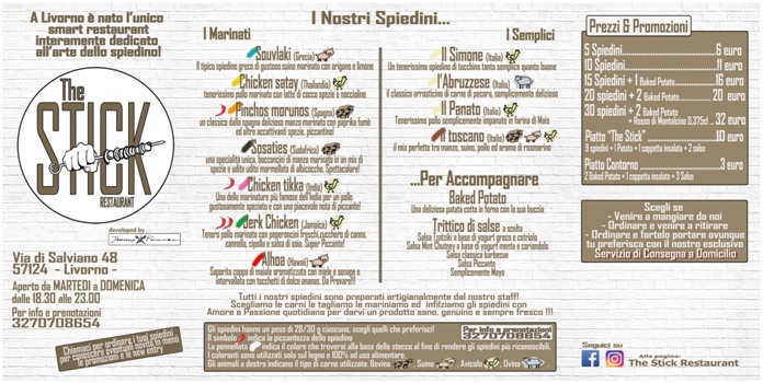 Tutto ciò che esce dalla nostra cucina è rigorosamente di nostra produzione”. Per completare l’offerta abbiamo inserito un contorno semplice e delizioso: una patata al forno cotta con la sua buccia ed accompagnata da due salse a piacere tra le clessiche maionese o barbecue alle più sfiziose Salsa Piccante, o a base di yogurt come lo Tzatziki greco o il Chutney alla menta. Insomma una gran quantità di cose da provare e gustare! Potete scegliere se andare a mangiare al The stick se chiamare ordinare e passare a prendere i vostri spiedini per mangiarli dove meglio credete o se farveli consegnare a Domicilio dai nostri corrieri Non vi resta che provare e deliziarvi il palato!