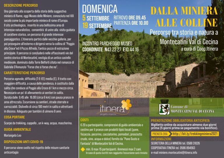 Nuovi appuntamenti alla miniera di Montecatini Val di Cecina domenica 5 e domenica 19 settembre due giornate di passeggiate dedicate alla scoperta della Miniera di Montecatini val di Cecina e del bellissimo paesaggio naturalistico in cui è inserito l’antico complesso industriale. Dal ventre della terra alla sommità della collina: una giornata alla scoperta della storia della suggestiva miniera di Rame, ripercorrendo le vie, le strade e i sentieri battuti dai minatori per recarsi a lavoro e poi ritornare a casa. Vi porteremo per mano a conoscere la storia della miniera di rame di Montecatini Val di Cecina, oggi Museo delle Miniere, conosciuta come la più importante miniera di rame d’Europa dell’800. Un percorso che partirà dalle vecchie gallerie, per poi proseguire verso Pozzo Alfredo, l’antico pozzo di estrazione principale, e fino a raggiungere la sommità della collina di “Poggio alla Croce”.
