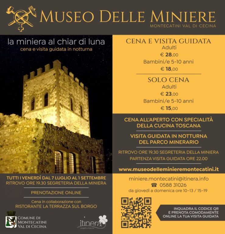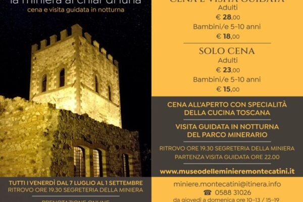 Tutti i venerdì dal 7 luglio al 1 settembre è possibile trascorrere una serata al chiar di luna all’antica miniera di rame di Montecatini Val di Cecina. Prenotazione obbligatoria anticipata. Tel. 0586/894563, mail [email protected]