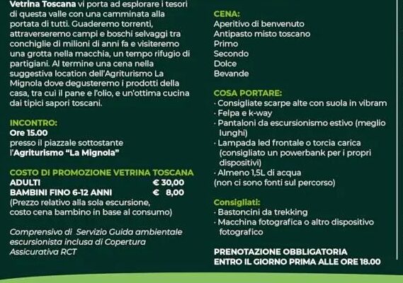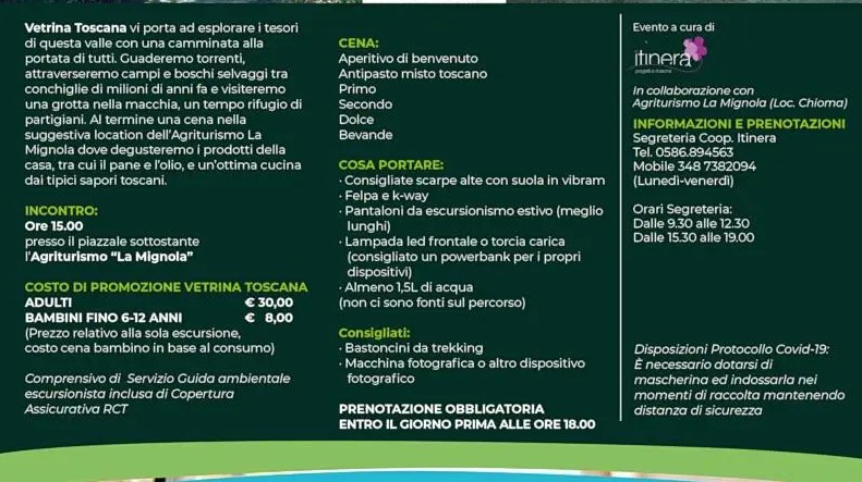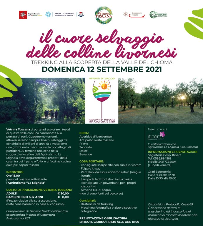 Un’esperienza originale per vivere il connubio tra conoscenza del territorio e cibo, che dai sentieri della Valle del Chioma guiderà grandi e piccini verso l’Agriturismo La Mignola dove, accolti e coccolati dai titolari, verremo immersi in un percorso questa volta fatto di sapori, odori e prodotti di qualità. Posti prenotabili fino a sabato 11 settembre alle 18 – contattare Segreteria Coop. Itinera ai seguenti numeri: 0586-894563 dal lunedì al venerdì (orario ufficio) mobile: 348-73.82.094 tutti i giorni dalle 9.30 alle 12.30 e dalle 16 alle 19.