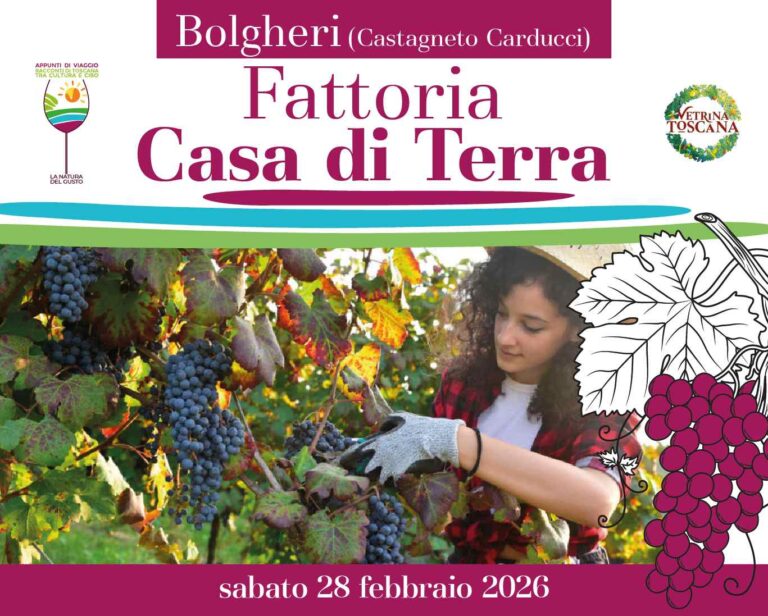 Sabato 28 febbraio in questo evento di Vetrina Toscana saremo ospiti della giovane e dinamica azienda vitivinicola Casa di Terra di Bolgheri, un territorio famoso in tutto il mondo per l’eccellenza dei suoi vini. Visiteremo la cantina per conoscere e ripercorrere le operazioni della vendemmia e della vinificazione e di tutto ciò che ruota intorno alle loro produzioni di eccellenza. È sorprendente, infatti, la complessità e la variabilità dei suoli del territorio di Bolgheri, un luogo dove le colline scendono verso il mare contribuendo a creare un mix unico di terreni e condizioni che sono state da guida durante la piantagione dei vigneti di Casa di Terra. Un’azienda che ogni giorno lavora in modo differenziato i vari appezzamenti cercando di interpretarne e preservarne al meglio le unicità che si esprimono prima attraverso le uve e poi nei loro vini. Al termine della visita sarà offerta una degustazione a cura della stessa azienda in abbinamento con una selezione dei loro vini e oli.