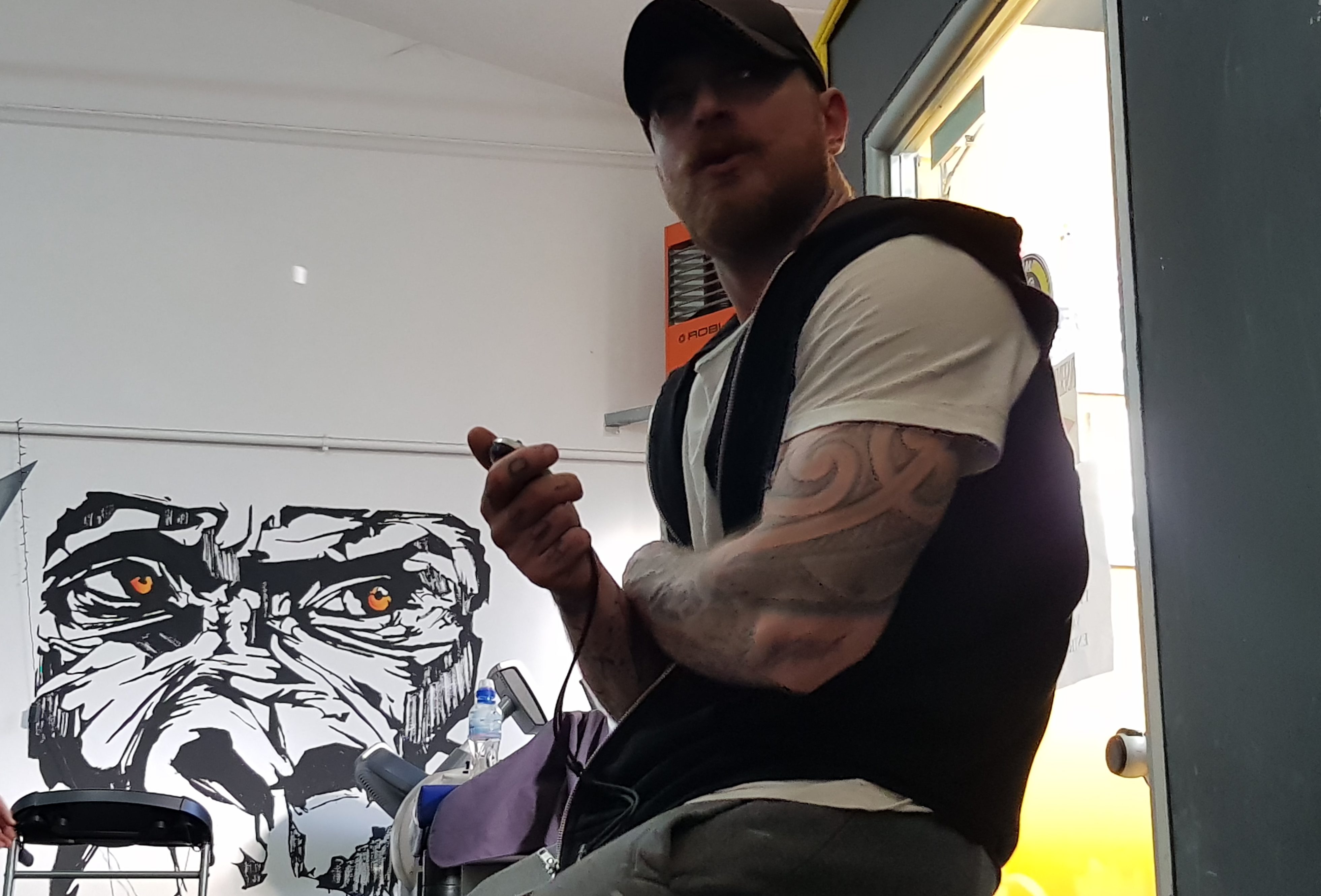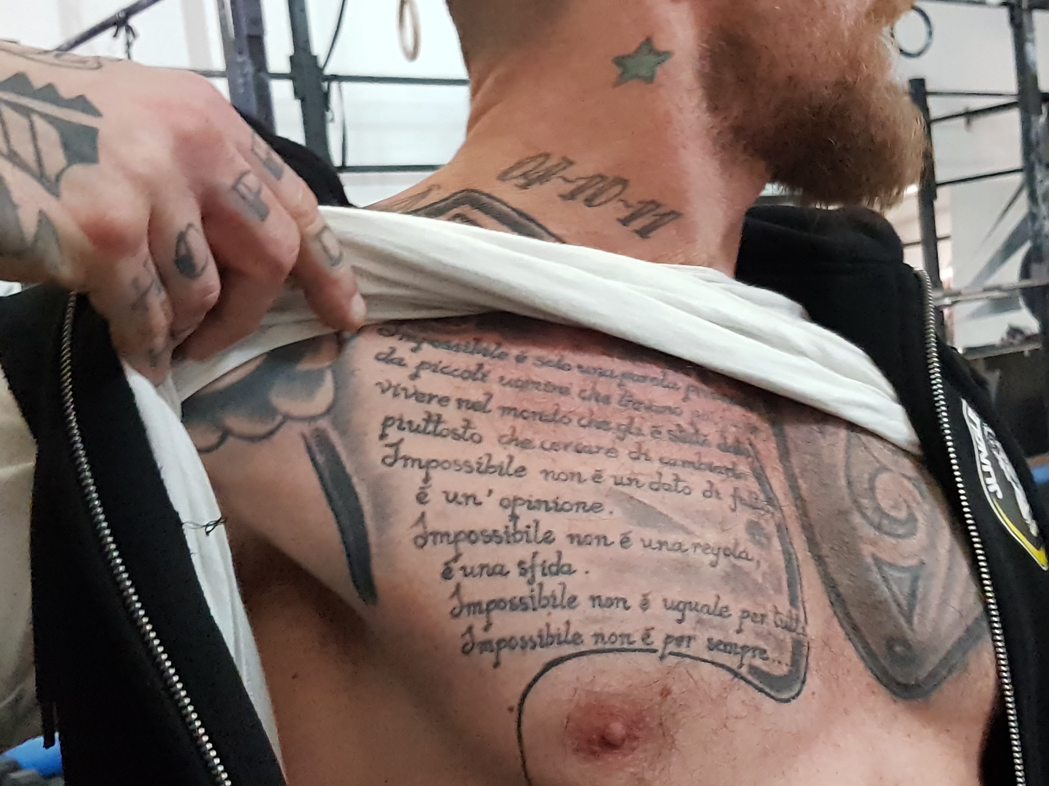 Sulla sua pelle una tela di tatuaggi lo avvolgono come una coperta calda. Dalle frasi di Mohamed Alì a un passo della bibbia del profeta Ezechiele, dal volto di Padre Pio (disegno fatto prima dell’incidente) fino alla data di nascita e al nome di sua figlia (Emma 4-10-11). Tre, due, uno… andiamo!