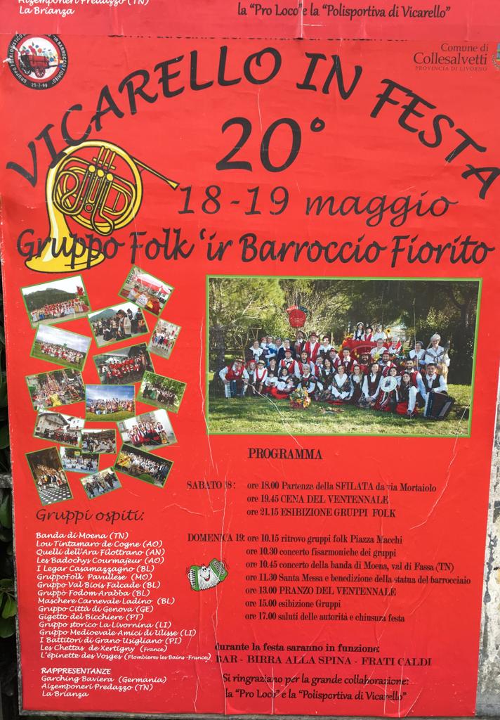Chissà se quel bambino di 12 anni che nel 1986 si innamorò del folklore della festa del bicentenario del Monte Bianco, durante quel raduno e tripudio popolare montanaro, si sarebbe mai immaginato che la “sua” Vicarello si sarebbe trasformata in un centro del folklore internazionale per due giorni. Nicola Cerretini, prossimo 45enne, vicarellese doc e vera memoria storica del paesino colligiano, è l’artefice e il fondatore del gruppo folkloristico “Ir Barroccio Fiorito” che in questo 2019 compie i suoi primi vent’anni. Una ricorrenza che non poteva passare in sordina e che va dunque onorata in tutto e per tutto. Così per per l’occasione la piccola frazione del Comune di Collesalvetti, di 3800 anime, ospiterà ben 24 gruppi folkoloristici provenienti da tutta Italia e anche dalla Francia, oltre 500 persone che saranno alloggiate negli agriturismi del territorio durante il weekend del 18 e 19 maggio. Una due giorni, che inizierà proprio sabato 18 a partire dalle 18 con la sfilata in costume per le vie del paese, da non perdere dove ci sarà da ballare, da cantare da godere dello spirito di aggregazione e di tradizione che i gruppi folkloristici portano con sé per natura, dei veri e propri portabandiera di valori genuini e della voglia di star insieme. Un programma intenso che vedrà oltre alla gran sfilata, la cena e le esibizioni dei gruppi (dalle 21,15 in poi di sabato 18) anche il concerto delle fisarmoniche (ore 10,30 di domenica 19 maggio) e il concerto della Banda di Moena, val di Fassa (10,45, domenica 19 maggio). Appuntamento imperdibile poi sarà il pranzo del ventennale, in programma alle 13 di domenica 19 maggio, aperto a tutti coloro i quali vorranno festeggiare e godere di questa festa di paese e poi via alle esibizioni folk dei vari gruppi.